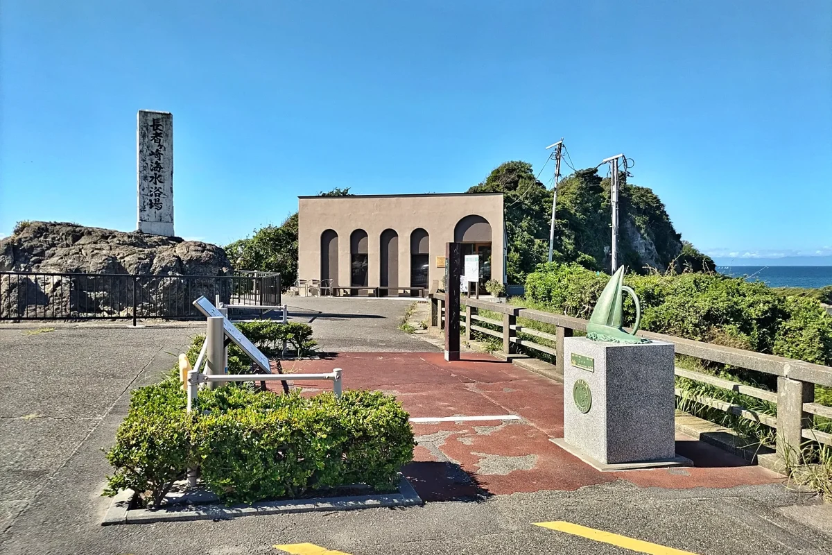 店は長者ヶ崎の駐車場の奥に。二輪車は無料で停められる