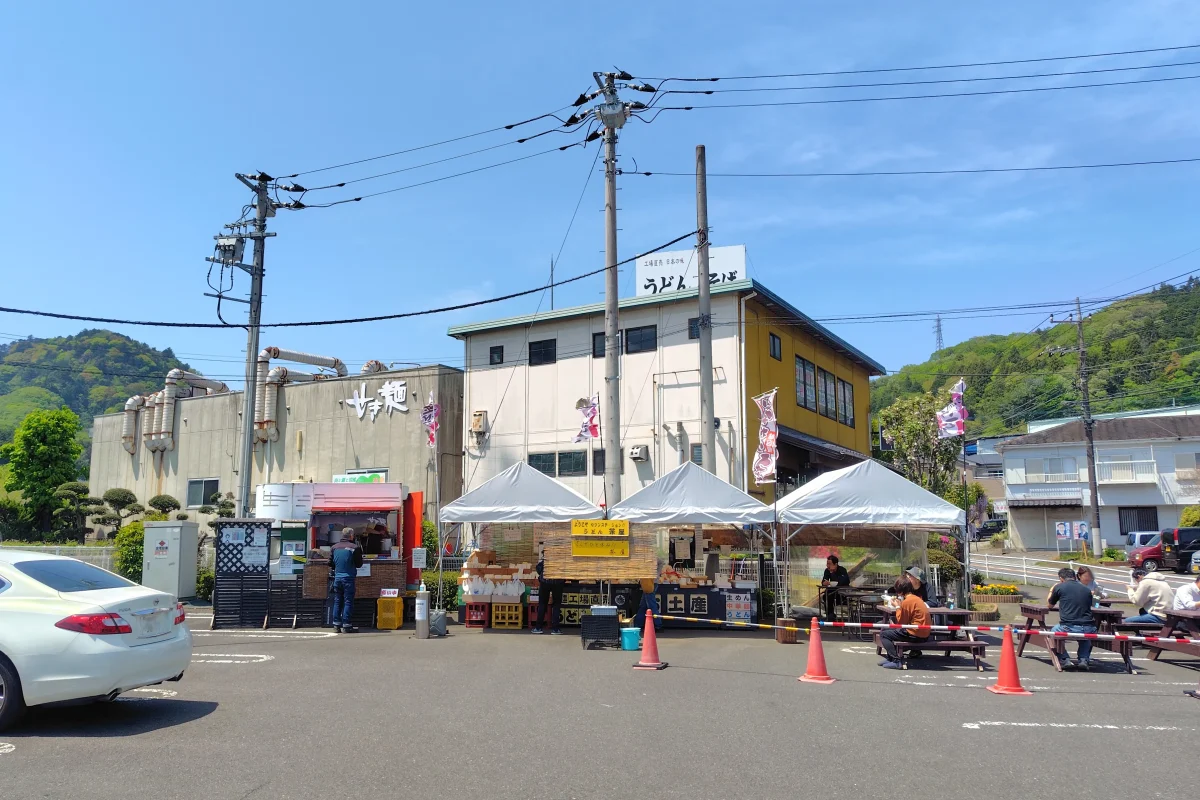 神奈川県の宮ヶ瀬湖の近く、国道412号沿いにある製麺会社の「せき製麺」が、駐車場の一角を使って「うどん」を提供しています。土日祝日の6時から営業していて、手軽に朝食が食べられます。隣接のセブンイレブンで買ったおにぎりなども持ち込みできるので、うどんだけでは、という人も大丈夫です。