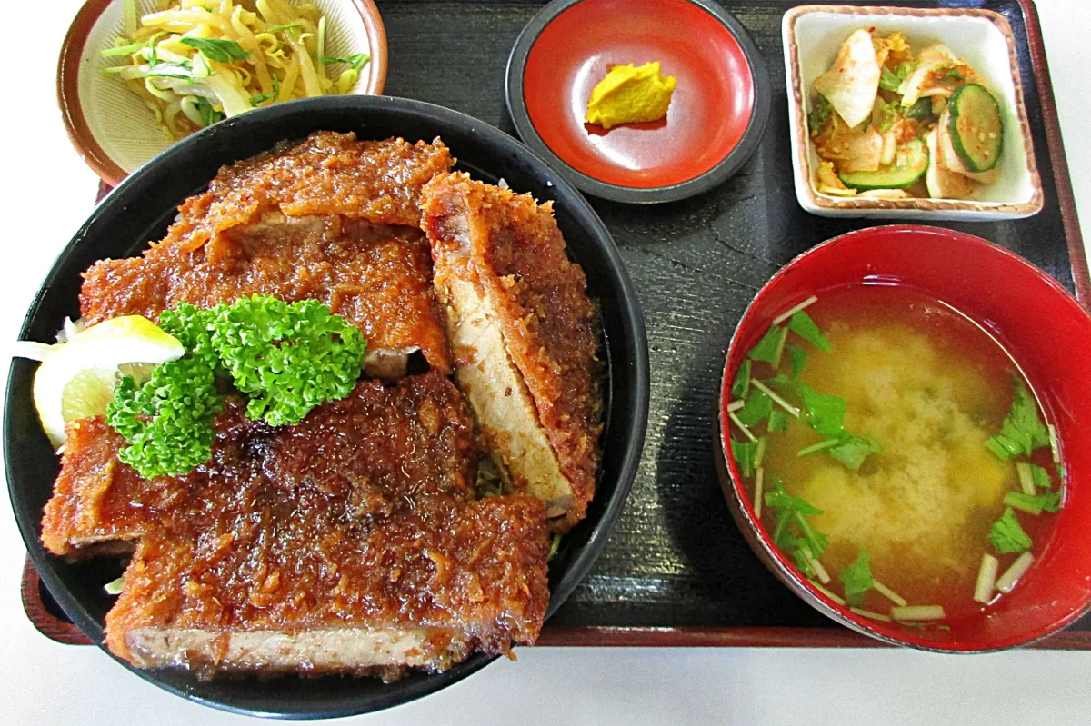 「ソースかつ丼」は福島県のソウルフード。会津を中心にして、県内の各地で食べられる。ソース味のかつ丼で、写真は「岳温泉」の「成駒食堂」(ツーリングマップル東北 P.19 E-4)のもの。会津若松の国道49号沿いの「十文字屋」(ツーリングマップル東北 P.18 E-6)の「磐梯かつ丼」などはものすごいボリュームで食べきれないほどだ