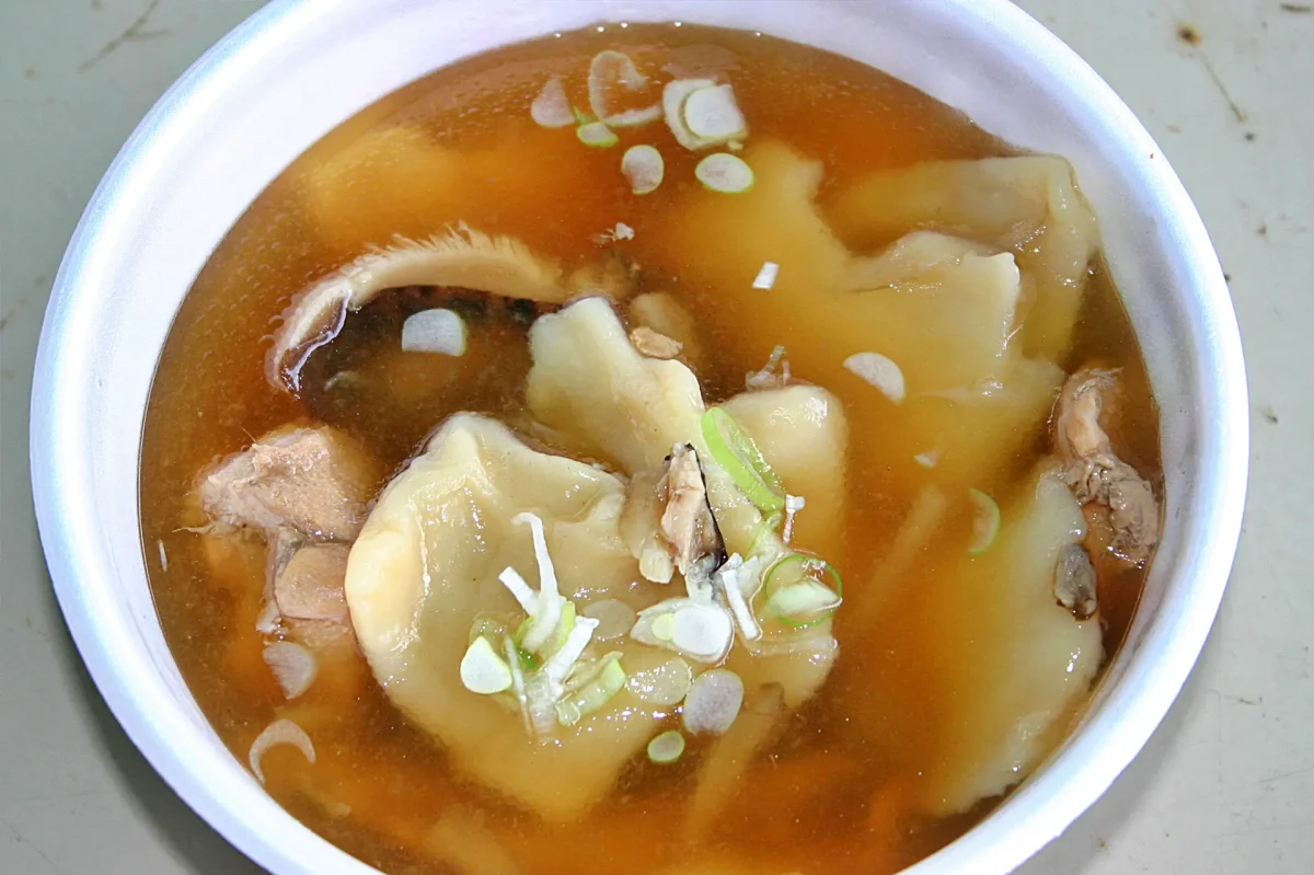 「ひっつみ汁」 。「ひっつみ」とは小麦粉をこねて薄く延ばした生地を手でちぎったもの。そば粉からつくる「そばひっつみ」もある。それを野菜と一緒に煮込んだものが岩手県の郷土料理の「ひっつみ汁」