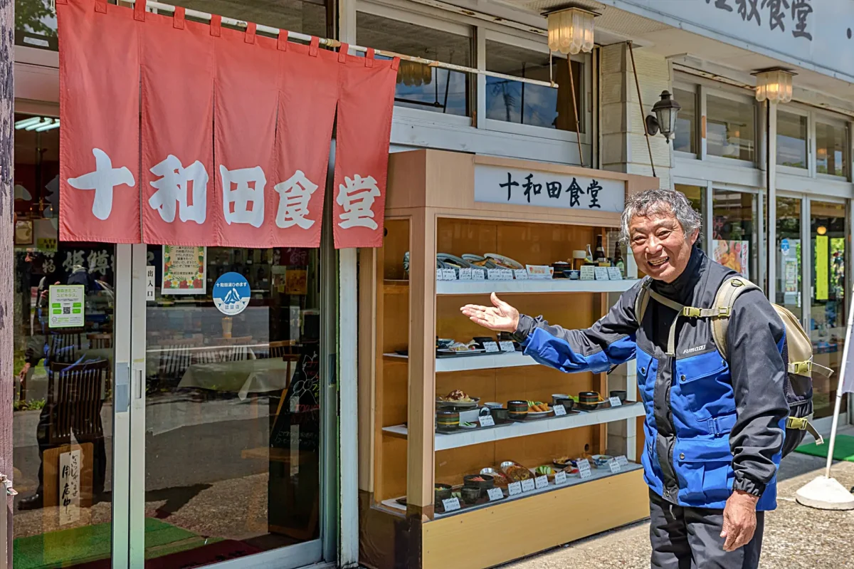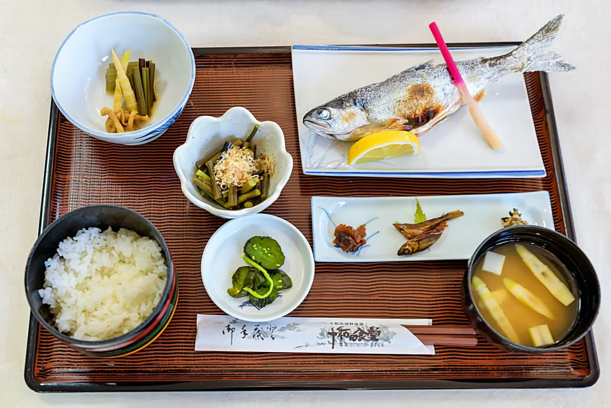 十和田湖畔、休屋「十和田食堂」(ツーリングマップル東北 P.89 I-7)の「ひめます塩焼き定食」。十和田湖のヒメマスは有名だが、もともとそこに生息していた魚ではない。和井内貞行が北海道・支笏湖のヒメマスの卵をふ化させて、稚魚を放流し、明治後期になって養殖に成功したものなのである。ヒメマスはベニザケの陸封魚。3年で20センチくらいになったものが一番美味だという。刺身で食べたり、フライにしたり、アルミホイルの包み焼きなどにもするが、なんといってもヒメマスを含めた川魚の食べ方で一番うまいのは塩焼きだ
