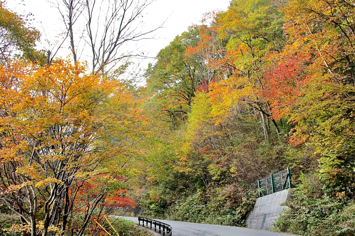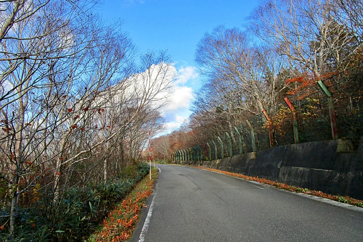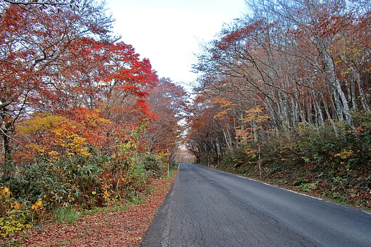 「後生掛温泉(ごしょうがけおんせん)」(ツーリングマップル東北 P.79 G-7)を過ぎると紅葉は終わり、岩手県境の「見返峠(みかえりとうげ)」に到達すると冬枯れの風景。岩手県側を下っていくと同じような冬枯れ→紅葉→緑といった変化が見られる。