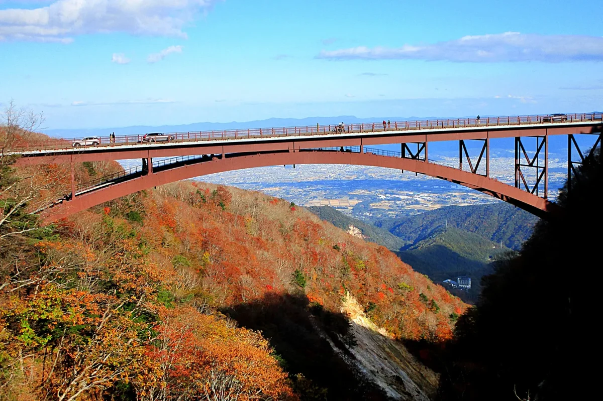 絶景ポイントのつばくろ谷にかかる「不動沢橋」(ツーリングマップル東北 P.24 C-6)からも、すばらしい紅葉が見られる。橋の向こうの、福島市街地の「信夫山」や阿武隈山地の「霊山」も紅葉している。