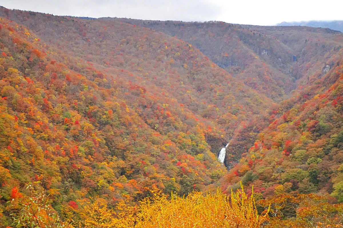 不動尊近くの展望台から見る不動滝。澄川の谷は一面の紅葉