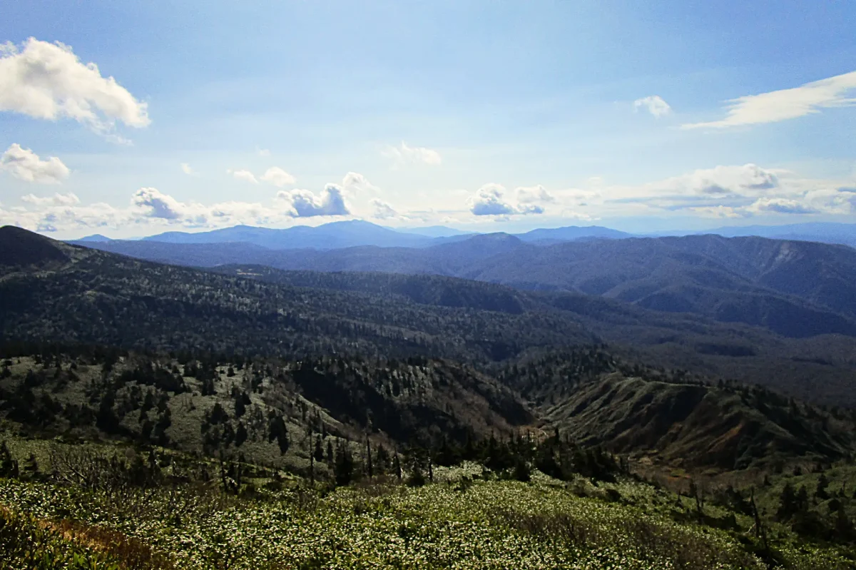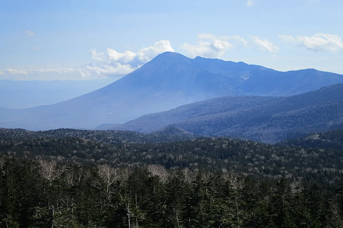 大深沢(おおぶかさわ)展望台(1560m)からの眺め。一番奥に鳥海山が見える※ツーリングマップル東北 P.73 H-1