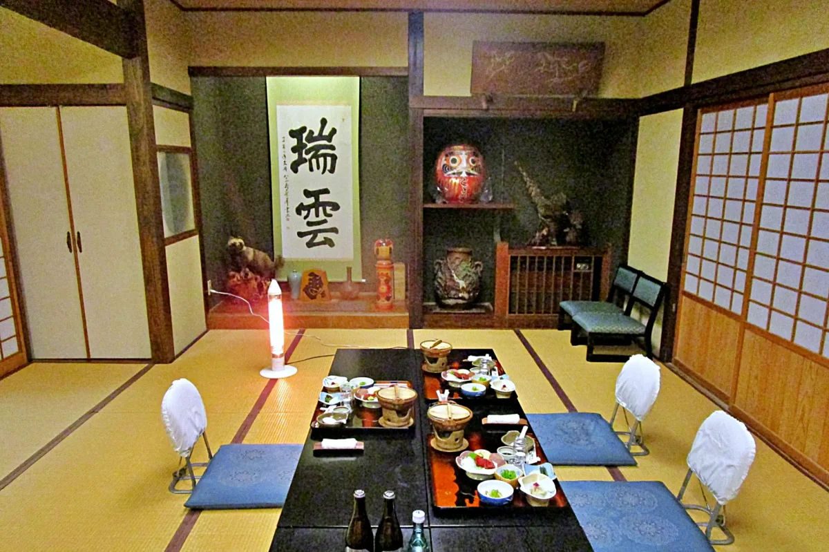【轟温泉「とどろき旅館」】 荒雄川沿いの一軒宿の温泉。大露天風呂は混浴。秋だと夕餉の膳にはふんだんに地元産のキノコが出る。