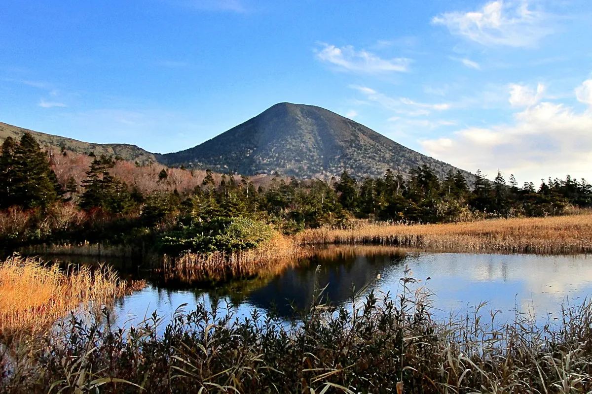 紅葉したブナ林の中を走り、八甲田の名湯、「酸ヶ湯温泉(すかゆおんせん)」(ツーリングマップル東北 P.94 H-7)を過ぎると、北八甲田と南八甲田を分ける「傘松峠」(ツーリングマップル東北 P.89 I-1)に到達する。傘松峠を下るとすぐに「睡蓮沼」(ツーリングマップル東北 P.89 I-1)。ここは八甲田を見るのには絶好のポイント。八甲田最高峰の大岳(標高1585m)がよく見える。