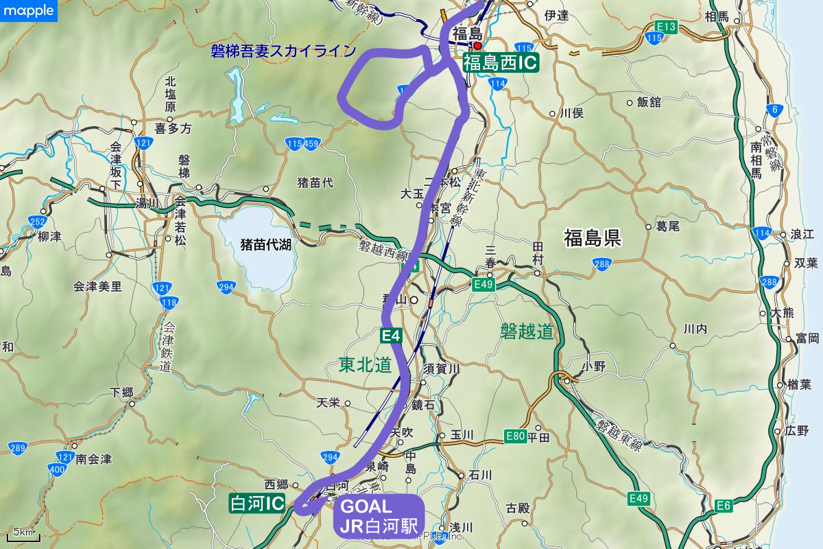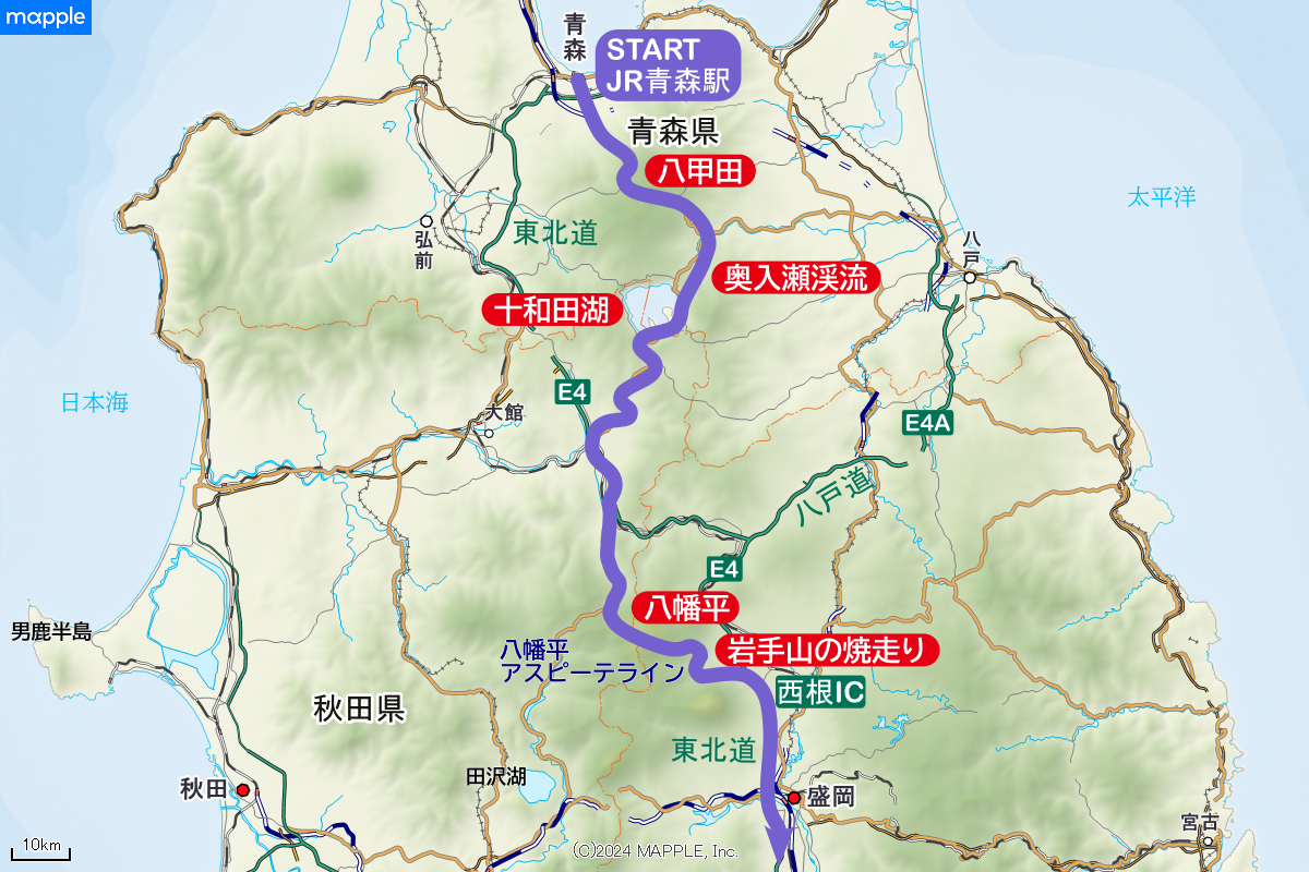 青森からは国道103号で八甲田から奥入瀬渓流、十和田湖を通り、発荷峠を越えます。ここまでが第1ステージ。つづいて第2ステージの八幡平アスピーテライン、第3ステージの鳴子峡、第4ステージの蔵王エコーライン、第5ステージの磐梯吾妻スカイライン編が続き、白河がゴールです。