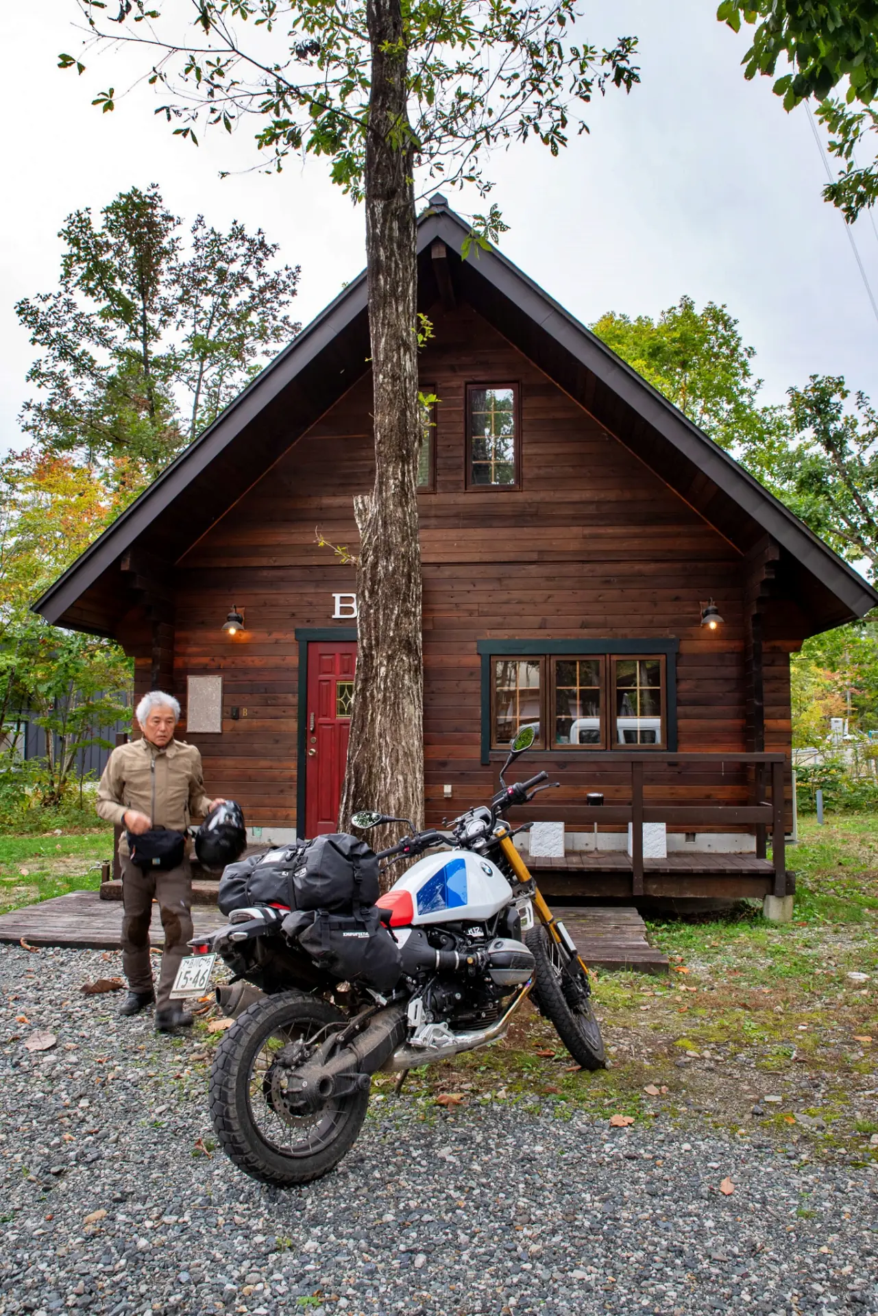 白馬では、個人的に定宿にさせてもらっている「ペンションミーティア」(ツーリングマップル中部北陸 P.93<関東甲信越 P.68>C-5)に宿泊するが、今回は、その敷地内にあるコテージ「ブラウニー」に泊まった。ペンションもコテージも冬はスキー客で常に満員となり、毎年恒例のBMWのユーザーミーティングでもまっさきに予約で埋まる人気宿。狭間の季節は狙い目だ。