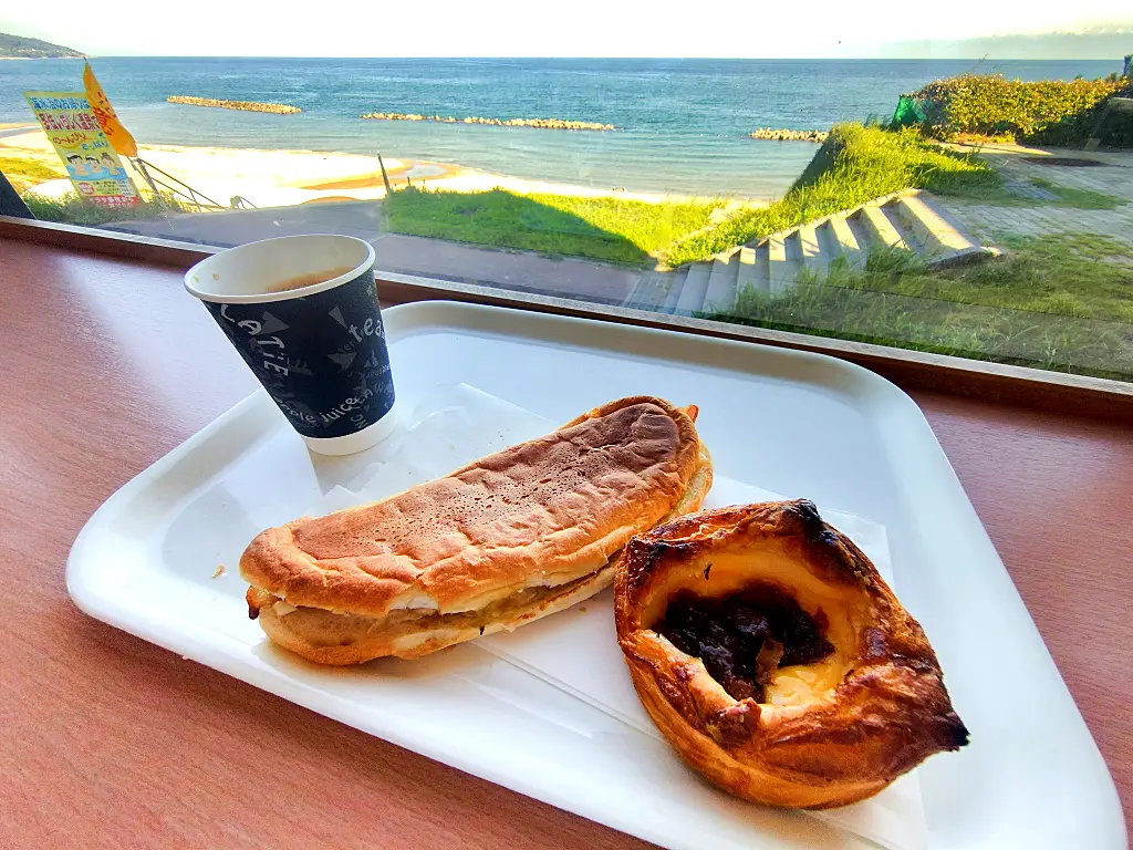 「道の駅 キララ多伎」[ツーリングマップル中国・四国 P.6 E-6]内の「キララベーカリー」。特産の「いちじく」を使ったパンに、美しい砂浜が広がるきららビーチを眺めるイートインスペースが魅力。ドリンクメニューも有、7:30からの営業も嬉しい