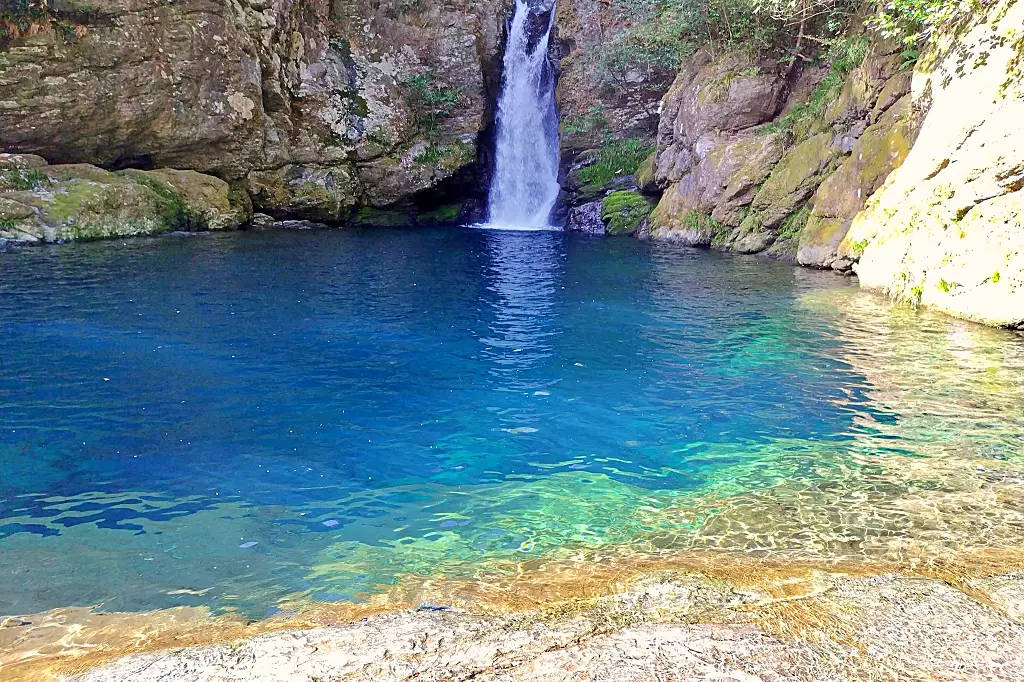 以前はロープの張られた急斜面の階段を下りて向かった、秘境感たっぷりの神秘的な滝壺「にこ渕」[ツーリングマップル中国・四国 P.77 C-6]。あらたに遊歩道が整備されて訪れやすくなりました。協力金100円必要ですので小銭をお忘れなく