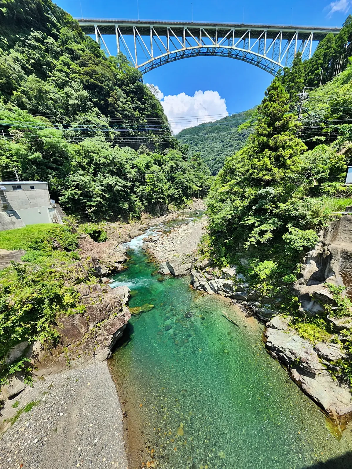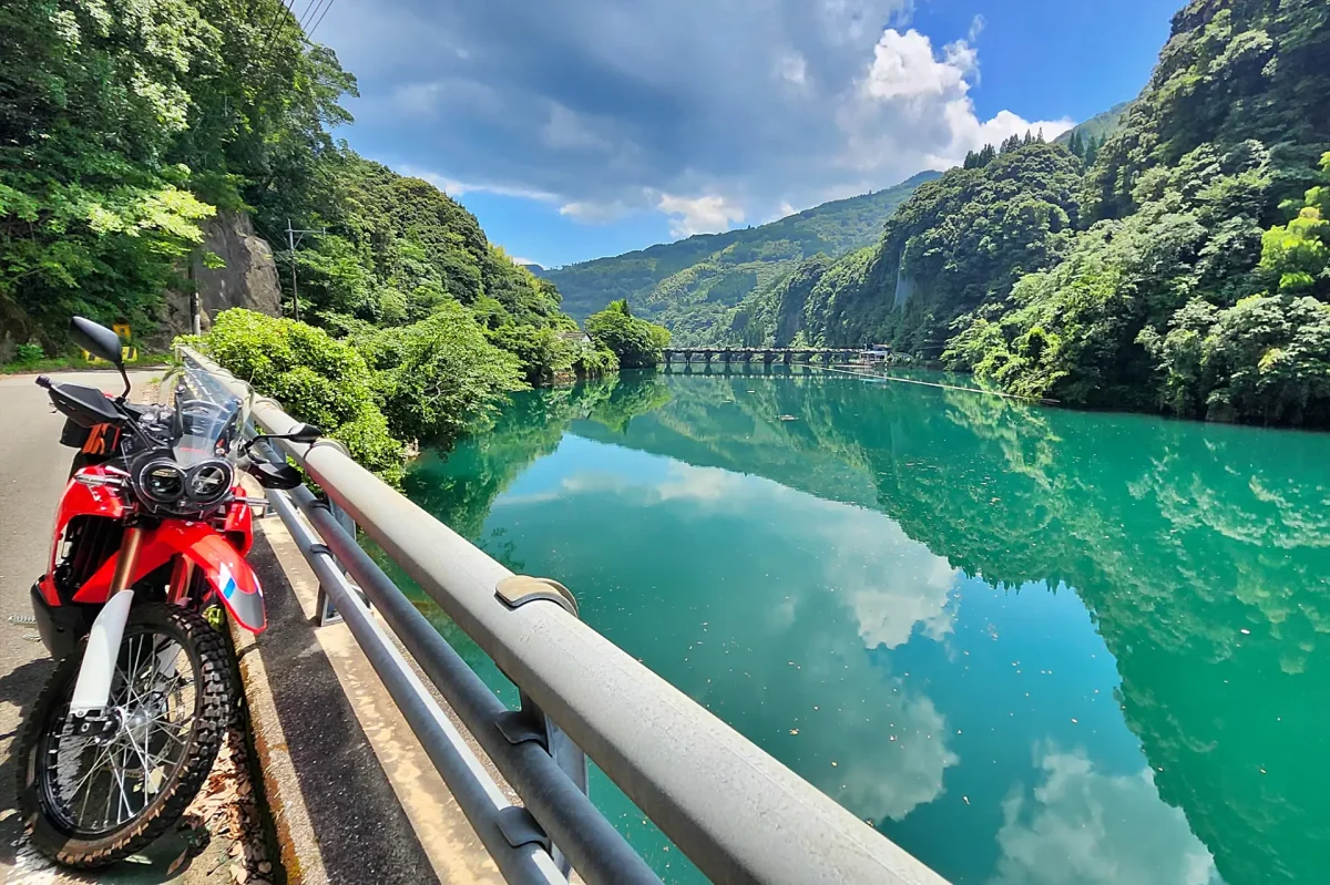 「旧第三五ケ瀬川橋梁」[ツーリングマップル九州沖縄 P.33 L-7] 昭和14年(1939)に完成した全長約268mの鉄道橋。 川の碧に映される姿が神秘的。橋は遊歩道として整備されていて歩いて渡れる