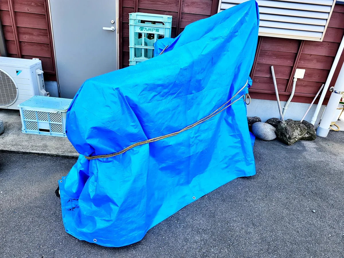 バイクをブルーシートで覆ってくれた。夜中は暴風豪雷雨だったので、とても助かりました。人の好意がなんとも身に染みて嬉しい