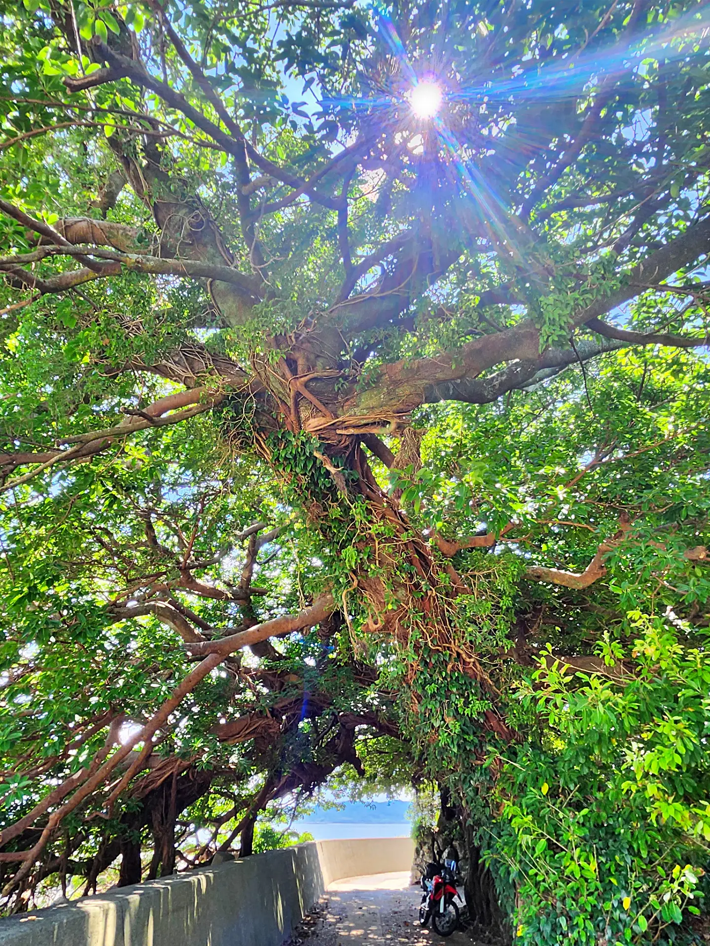 さらに、下へ降りると道があるので、海岸線に沿って少し走ると、巨大なアコウのトンネルに遭遇。そのヒシヒシと伝わる生命力の強さに思わず「スゴイ!スゴイ!」の連発。「何気」に誘われて出会えたこの素晴らしい風景に感動ひとしおなのでした。