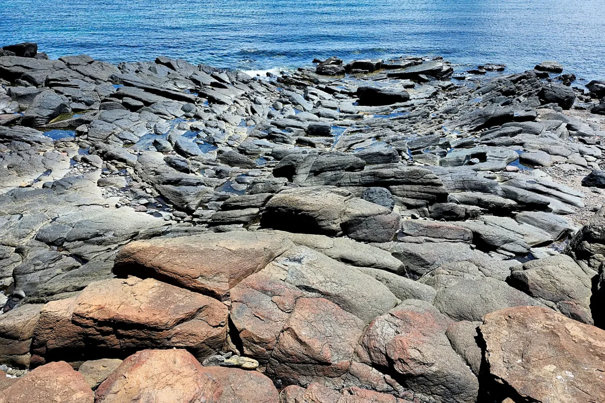 眼下には灯台と一帯に広がる溶岩のような岩々。