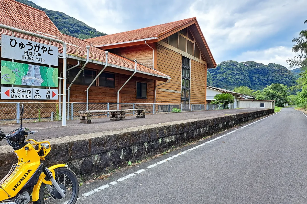 日向八戸駅跡[ツーリングマップル九州沖縄 P.33 L-7]。 現在は森林セラピーロードの休憩スポットに