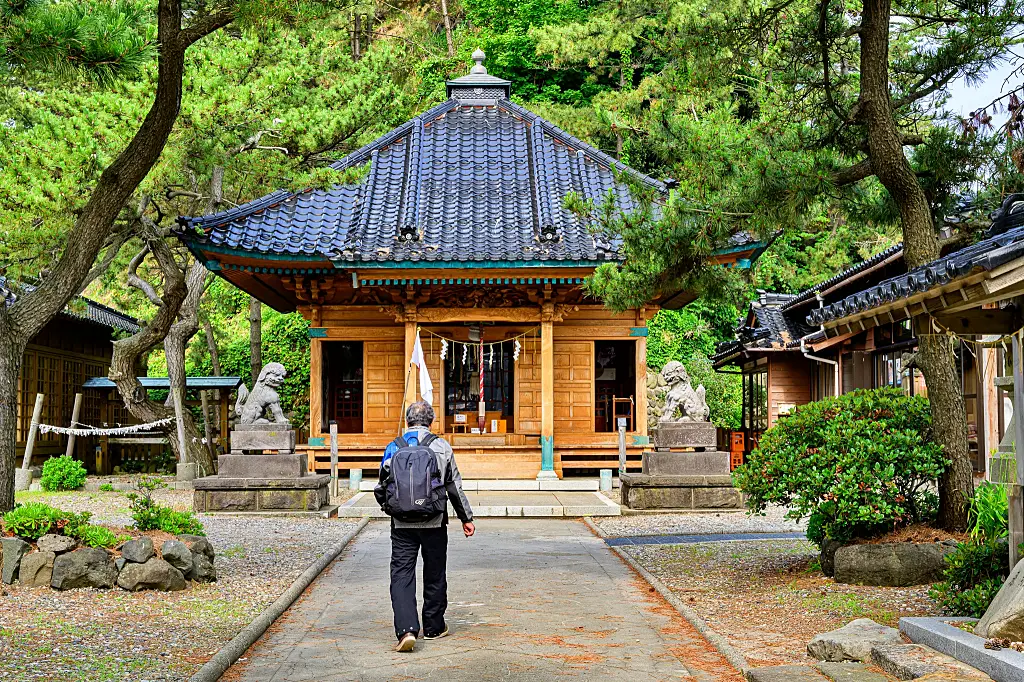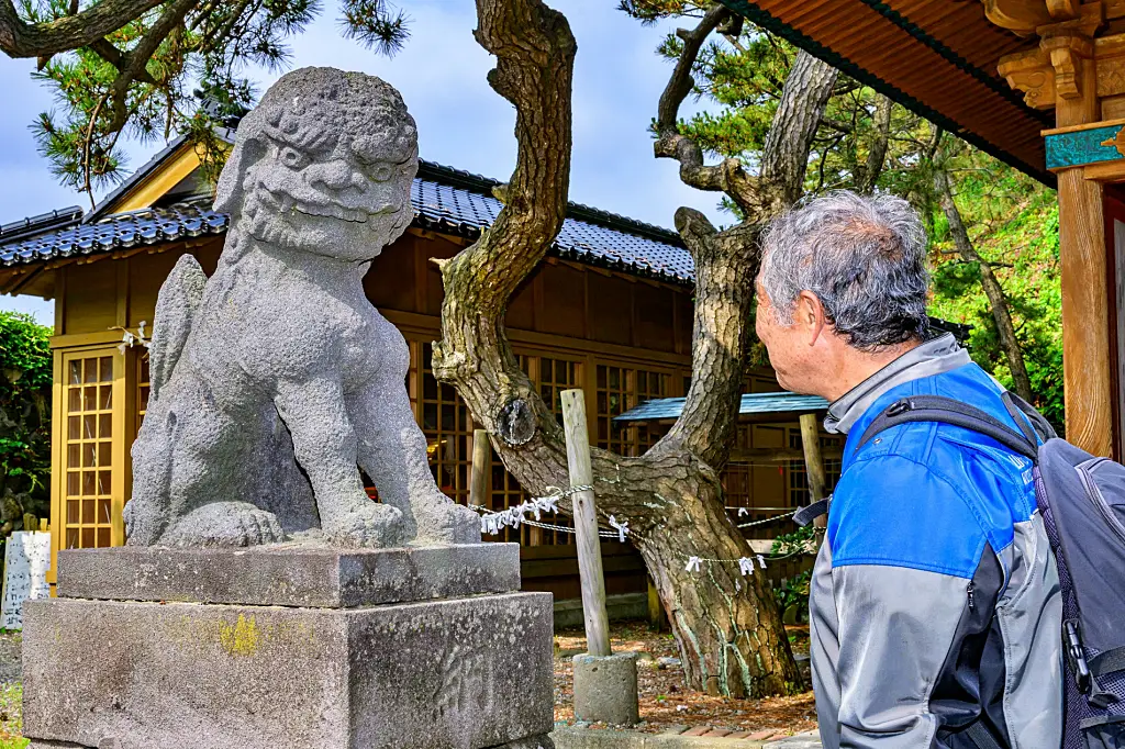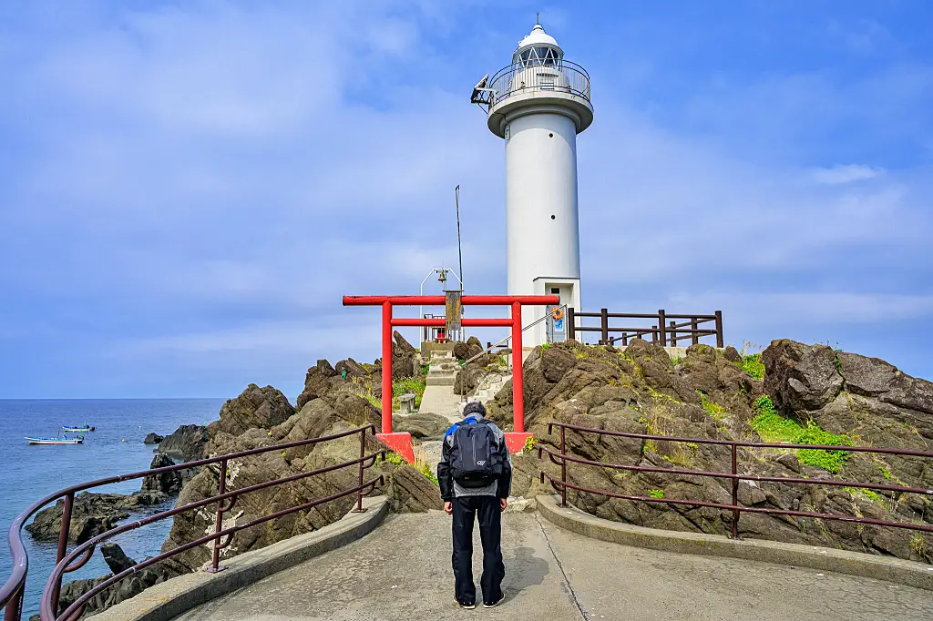 JR羽越本線の鼠ヶ関駅、名木「念珠の松」と見てまわり、地続きの弁天島の厳島神社を参拝し、突端の灯台へ。そこには金毘羅神社が祀られている。