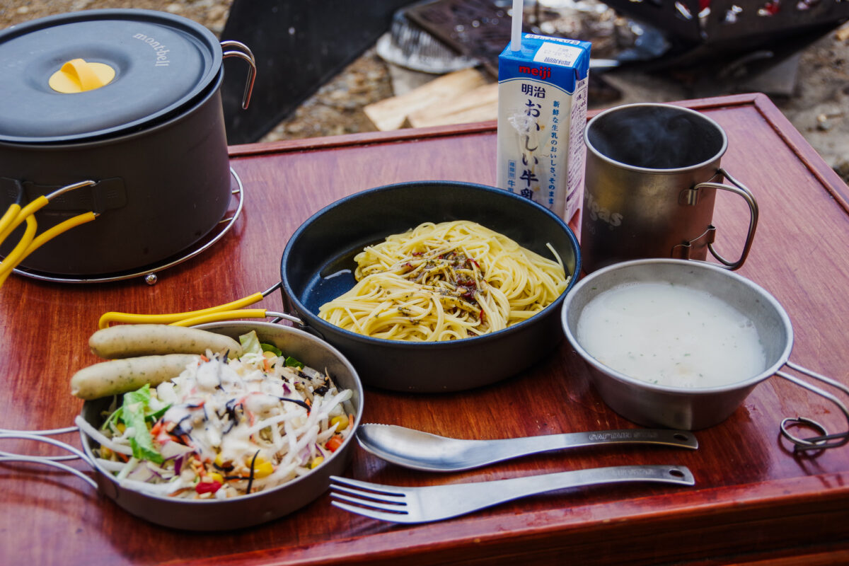朝食➡やっちまった。朝食用に買っておいたパンを忘れてきてしまった。非常食用の乾麺(うどん)は持っていたので、あとは手持ちの食材と調味料でなんとかするしかない。で、できたのがカルボナーラ風うどん。目玉焼き用に持ってきた卵とマヨネーズ、ブラックペッパーを使って、なんとか完成。やればできるじゃん・・・
