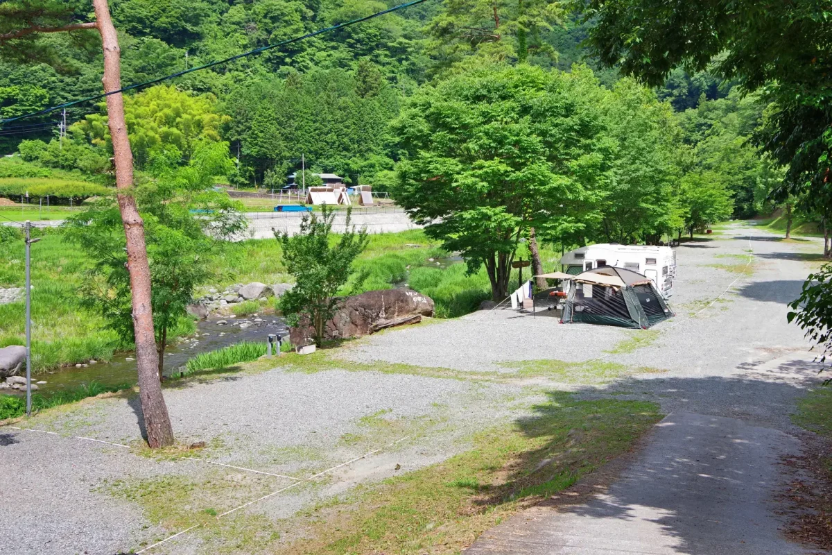 サイトの下で川遊びができるリバーサイト。サイトは砂利・土
