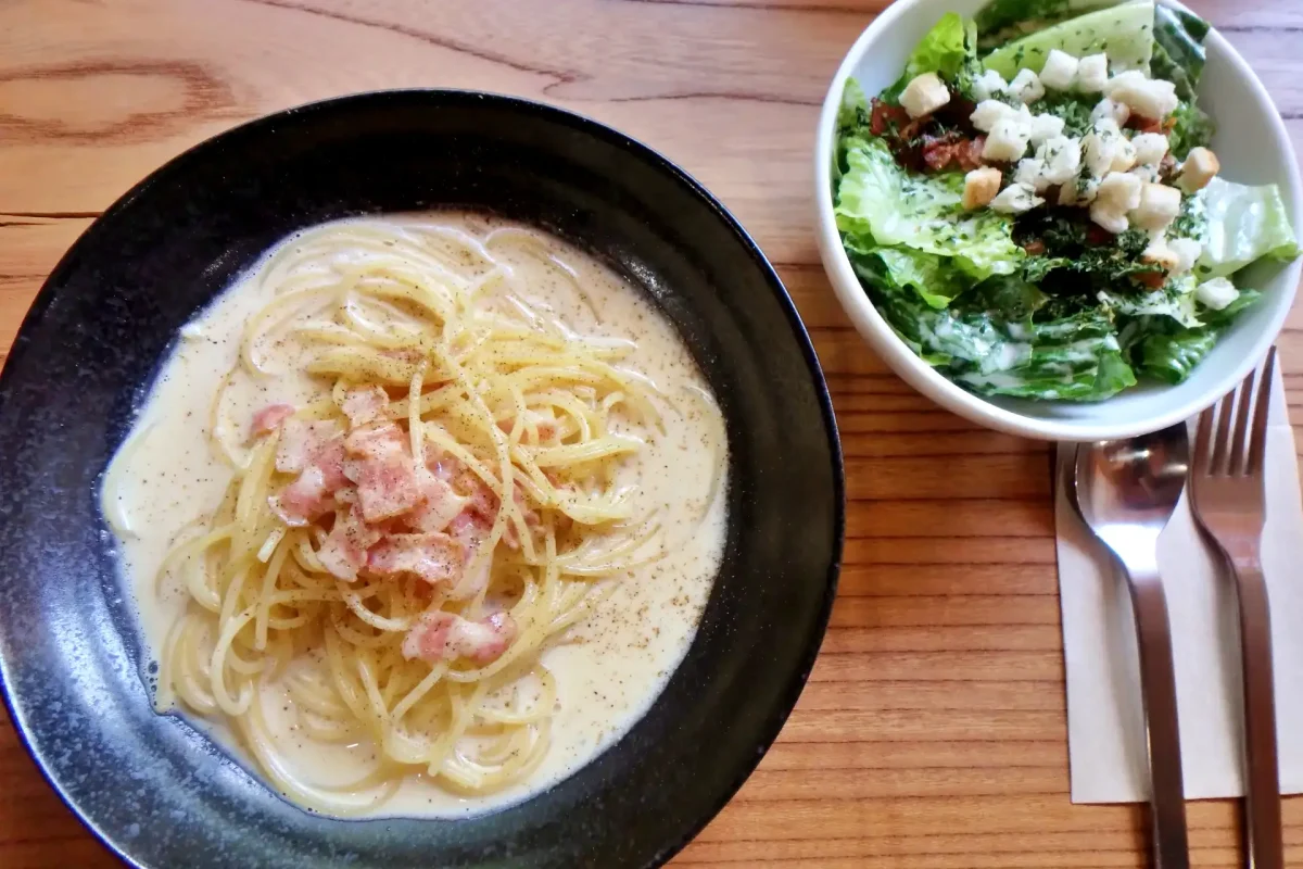 本日のパスタセットはカルボナーラ。ミニシーザーサラダ&ドリンク付き1100円