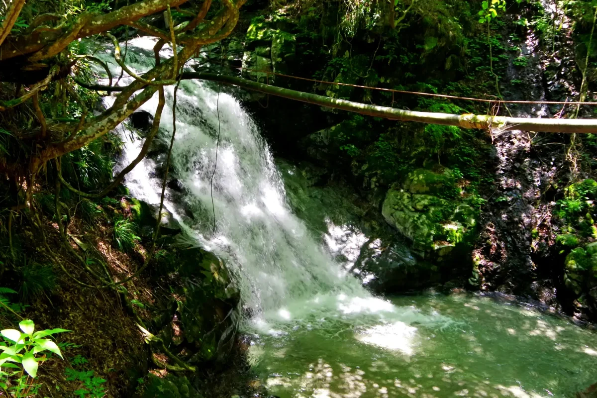 的様のすぐ下にある的様の滝。滝壺に下りる階段が崩れていて、梯子も外れかけているようだったので下まで降りられず