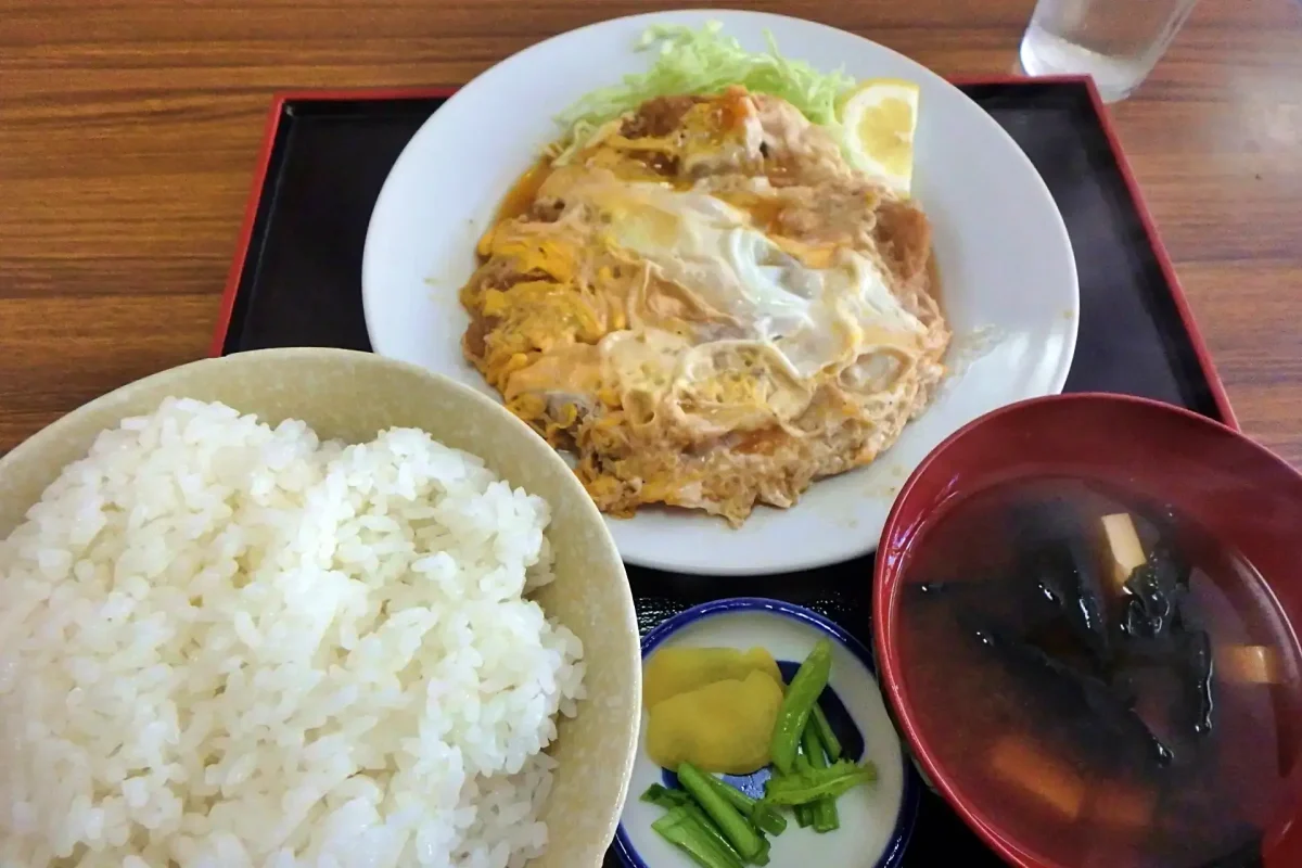 メニューを見て、注文したのは煮カツ定食。見た目はカツ丼の別盛りといった感じで、ご飯はどんぶりに山盛り、卵でとじた煮カツもけっこうな量があり、完食できるか不安だったが、食べ始めると箸を止めることもなく完食。久しぶりに白米もたらふく食べることができた。