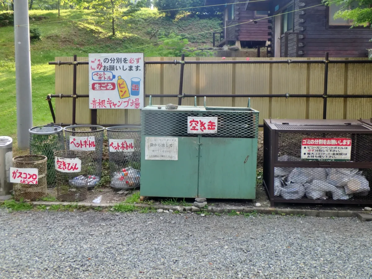 グリーンサイト側炊事場の近くにあるゴミ捨て場。ビン、缶、ペットボトルは袋から出して、それぞれのカゴへ入れる