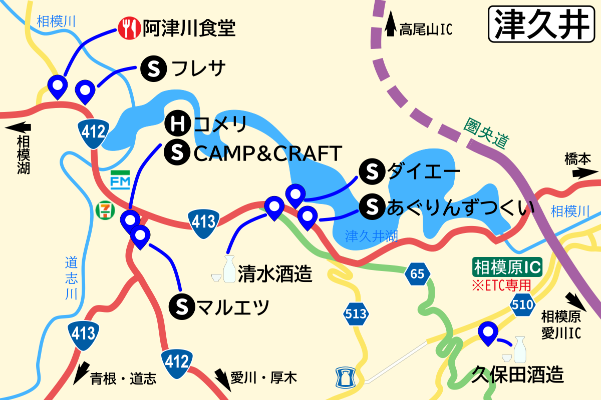 神奈川県内には13の酒蔵があり、そのうち2軒が相模原市内にある。道志へのアクセスで圏央道の相模原IC※を使えば、そのすぐそばに「久保田酒造」、さらに津久井湖の近くに「清水酒造」があるので、道志方面へ向かいながら効率的に酒蔵巡りができる。