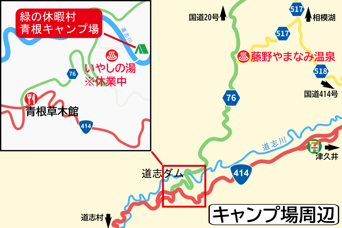 緑の休暇村 いやしの湯(すぐ):TEL 042-787-2288 神奈川県相模原市緑区青根844 営 10:00~20:30(1~2月は~19:30) 休 火曜(祝日の場合は翌日休) ※改修工事のため2025年4~12月休業