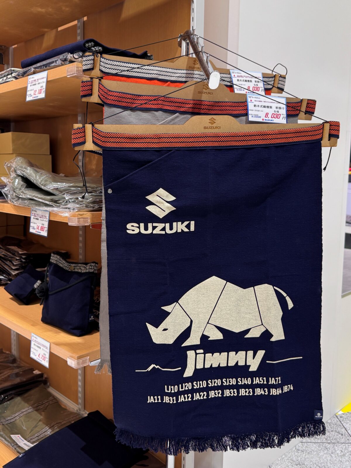 ジムニーのシンボルマークとして知られるサイのマークは、ジムニーオーナーでなくとも使いたくなるかわいさですよね。スズキの公式オンラインモール「S-MALL」で売っているグッズと同じものがこちらでも展示・販売されていました。