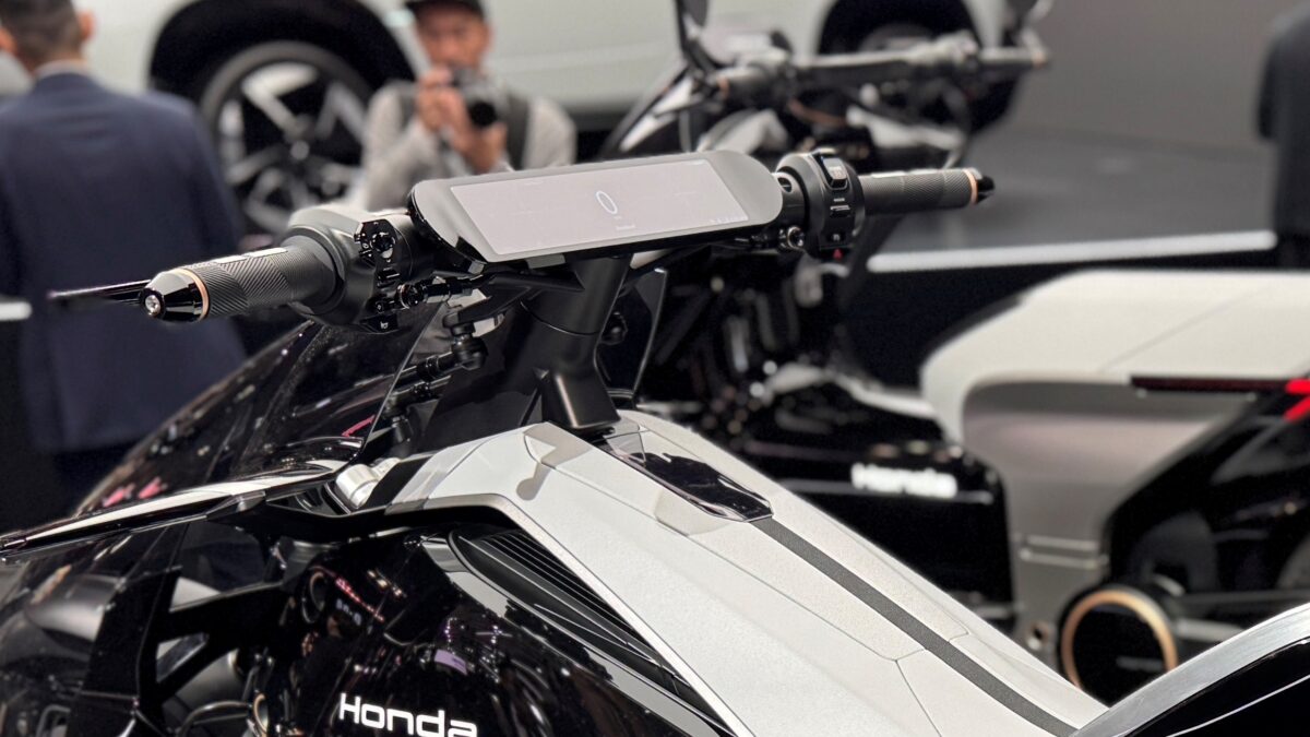 メーター類はハンドル中央のディスプレイに表示。ミラーもカメラで画面に表示。その下(従来のバイクのタンク部分)にもサブディスプレイがあり、モーターの駆動状況や地図など様々なデータが表示できるみたい