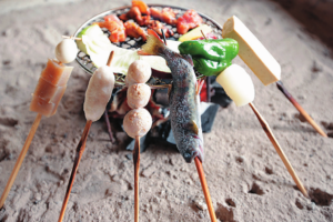 高森町特産の「つるの子いも」(田楽のために作られたいも)を中心に、やまめやこんにゃく、豆腐や旬の野菜などを、独特の味噌(山椒味噌やゆず味噌)で味付けします。それらを串に刺し、囲炉裏の炭火で焼く料理。