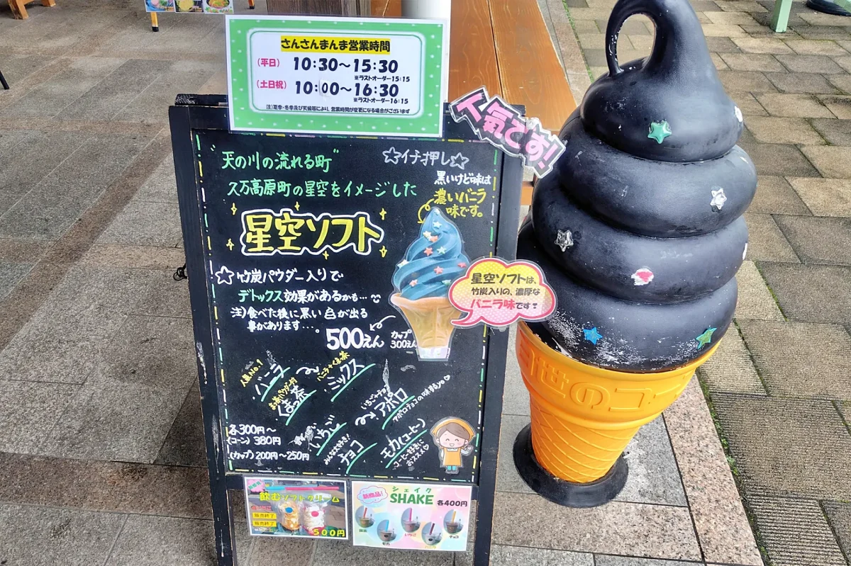 2026年度版から、新たに追加される「ベーカリー」のアイコンの情報入手のためのパン屋さん巡りで立ち寄った、愛媛県久万高原町の「道の駅 天空の郷さんさん」。パン工房で購入したパンにあわせて、何か飲み物でもと、駅内を歩いていたときに、目に付いた「星空ソフト」を思わず注文してしまいました。