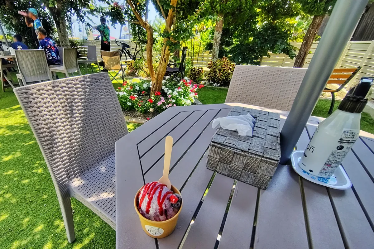 住宅街の一角に建つ白い建物の前にはテラス席が設けられ、この日はサイクリストのグループで賑わっていました。これからの季節、少し涼しくなるこれからの季節、星のビーチで海を眺めながら味わうのも良いですね。