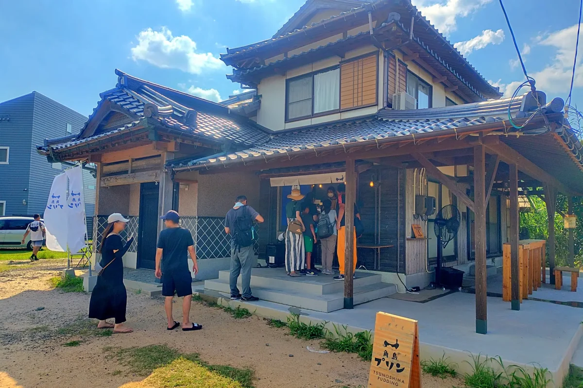 山口県下関市の観光スポット、「角島大橋(つのしまおおはし)」のほど近くにある、大人気のプリン屋さんを、今年の表紙撮影時に訪問しました。県道275号沿いの広い敷地に建つ古民家には、青い「角島プリン」の大きなバナーが掲げられ、思わず目を引きます。