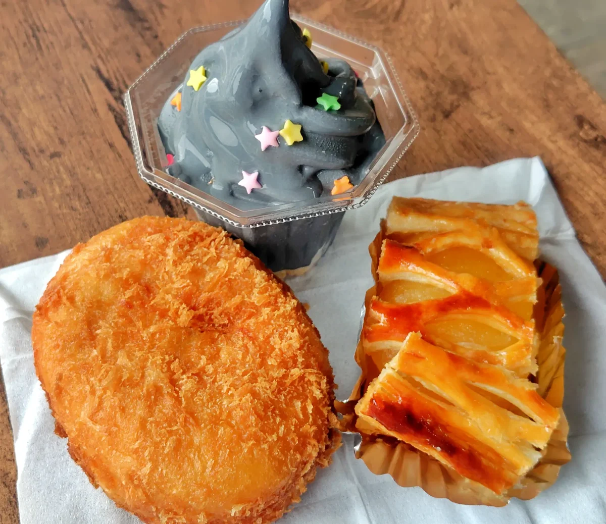 星空をイメージした竹炭パウダー入りの黒いバニラには、星があしらわれていて、目も舌も楽しめました。ランチバイキングや充実したメニューのフードコートもあるので、休日は混雑しますが、新しい駐輪スペースが追加されて、立ち寄りやすくなりました。
