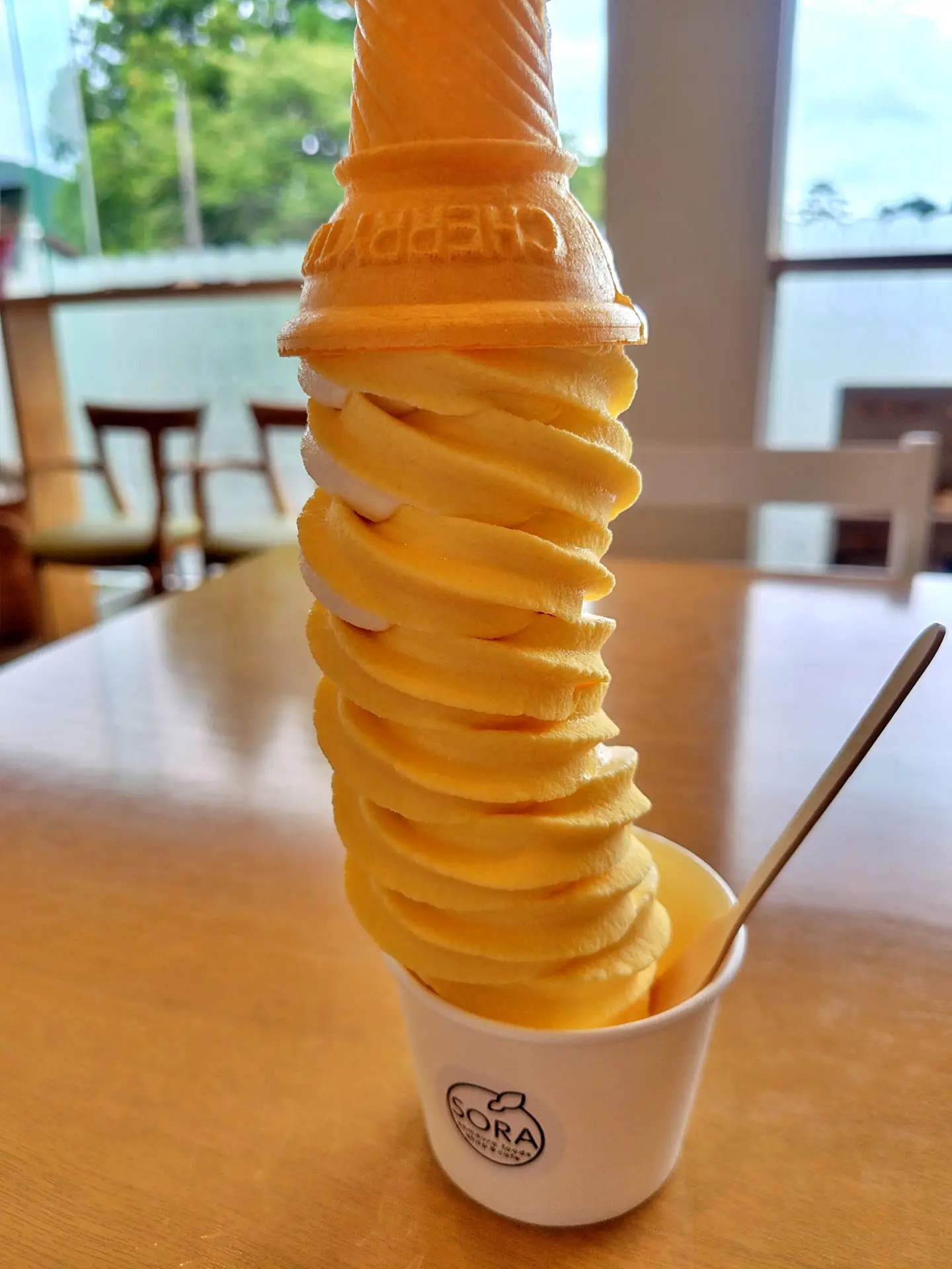 高知県中部の本山町の国道439号沿いにあるさめうらフーズ直営店「SORA」。高知県特産の柚子製品を手掛ける「さめうらフーズ」の直営店で、柚子を使ったパフェやソフトクリーム、ドリンクがいただける休憩スポットで、落ち着いた店内でゆったり涼むことが出来ます。なかでも、逆さのコーンが目を引く30㎝の「SORAソフト」はビックリメニューながら、お財布にも優しいお手頃価格です。
