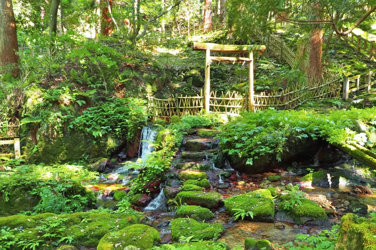 一帯は「瓜割名水公園」になっていて、四季折々の花々が美しいが、特に初夏のアジサイは見事。取水口は駐車場内にあり、持ち帰る場合は協力金300円。参道の店「名水の里」(4~10月上旬営業)で売っている名水まんじゅうもぜひ。
