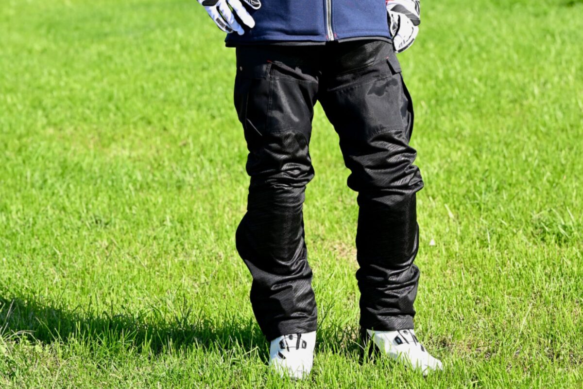 特徴:軽量で動きやすく、様々な機能性素材(コーデュラ、ナイロンなど)があります。特に「コーデュラ素材」は摩擦や引き裂きに強いので、転倒からの滑走時など、他の素材よりいくらか被害を抑えられるでしょう。コーデュラはデニムなどにも混紡されたりと、バイク用パンツにはよく用いられています。
