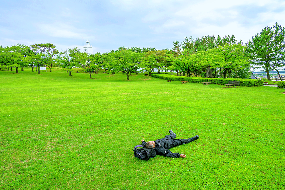 最上川河口の日和山公園でゴロリと朝寝。気持ちいいなあ~!