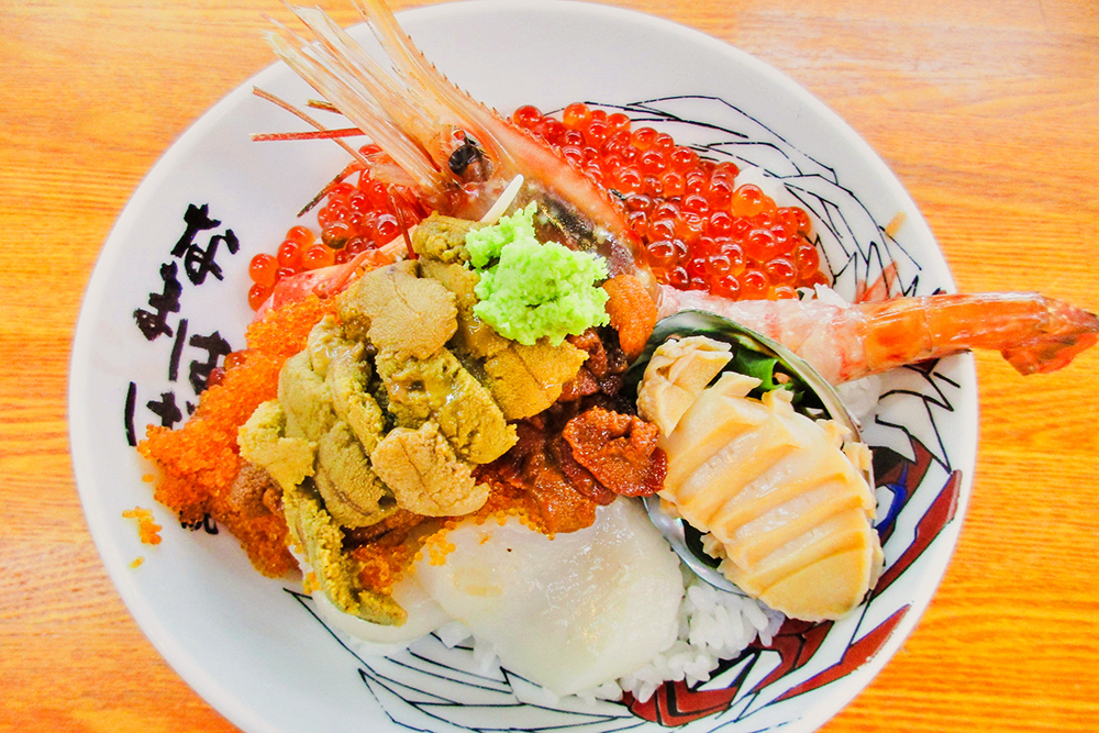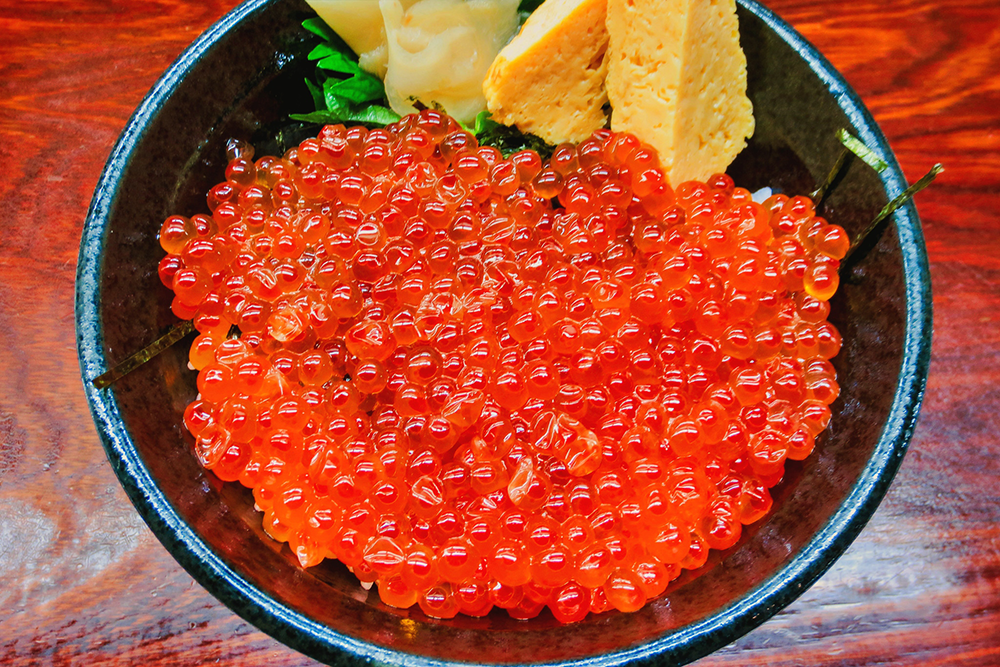 この新鮮市場内には早朝から営業している「丸青食堂(まるあおしょくどう)」がある(7時~15時30分)。じつにありがたい。本マグロ丼や3色ホタテ丼、サーモン親子丼などメニューが豊富だ。僕はその中から「イクラ丼」を選んで食べた。丼の白飯を覆い尽くすイクラに圧倒された。