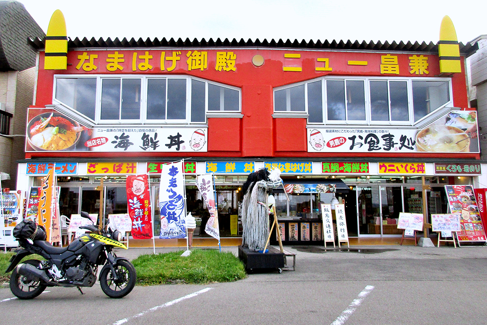 周囲には何軒もの食事処があるが、早朝からやっているのは「なまはげ御殿」(9時~16時)。ここでは「海鮮なまはげ丼」を食べたが、ウニ、ホタテ、アワビ、イクラ、ブリコ、エビ、カニと、具だくさんでボリューム満点。「ブリコ」とは、ハタハタの卵のこと。食せば男鹿の風土を感じ取れる。ここではほかにも男鹿名物の「石焼料理」が食べられる。