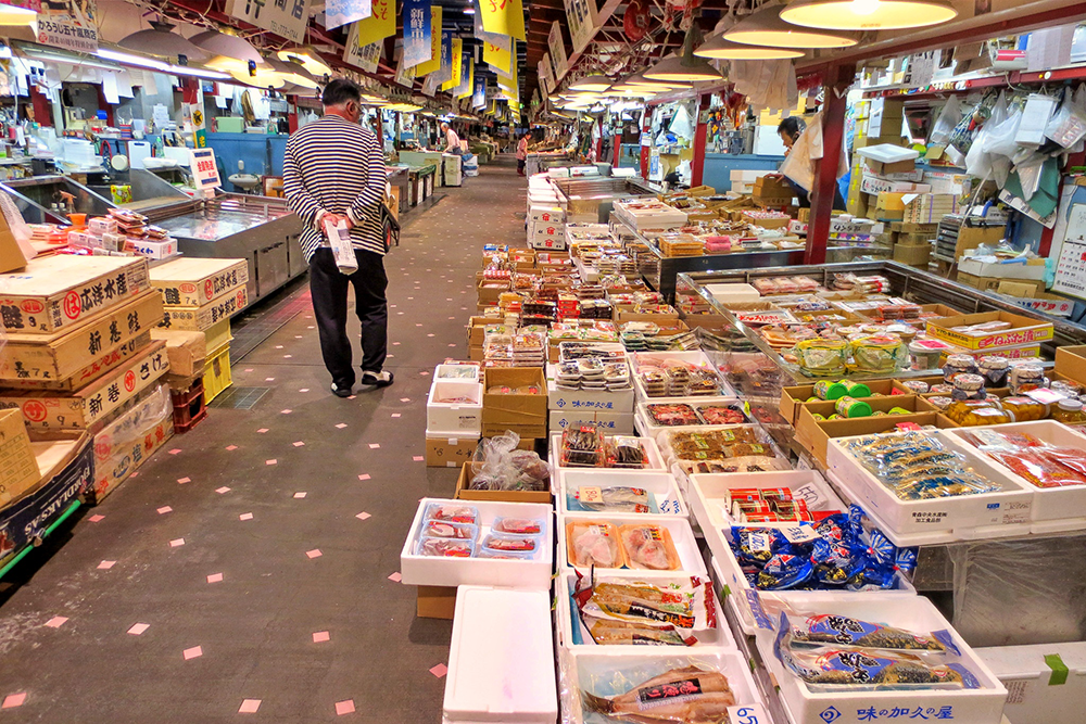 新装された青森駅前の複合施設「AUGA(アウガ) 」の地下に「新鮮市場」がある。朝5時からやっている市場内には数多くの海産物店があり、店頭に津軽海峡、太平洋、日本海と3つの海の幸が並ぶ。