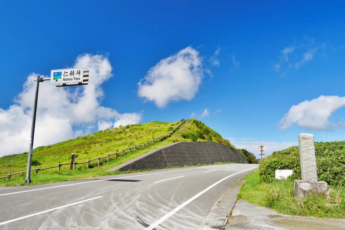 県道411号の「仁科峠」。周辺には牧草地が広がっている