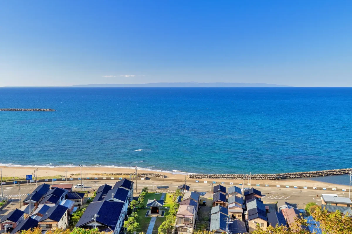 出雲崎町の「妻入りの町並み」を見られる「良寛と夕日の丘公園」のすぐ下には、良寛の生家跡に建つ「良寛堂」がある。そして、日本海には佐渡島が浮かぶ