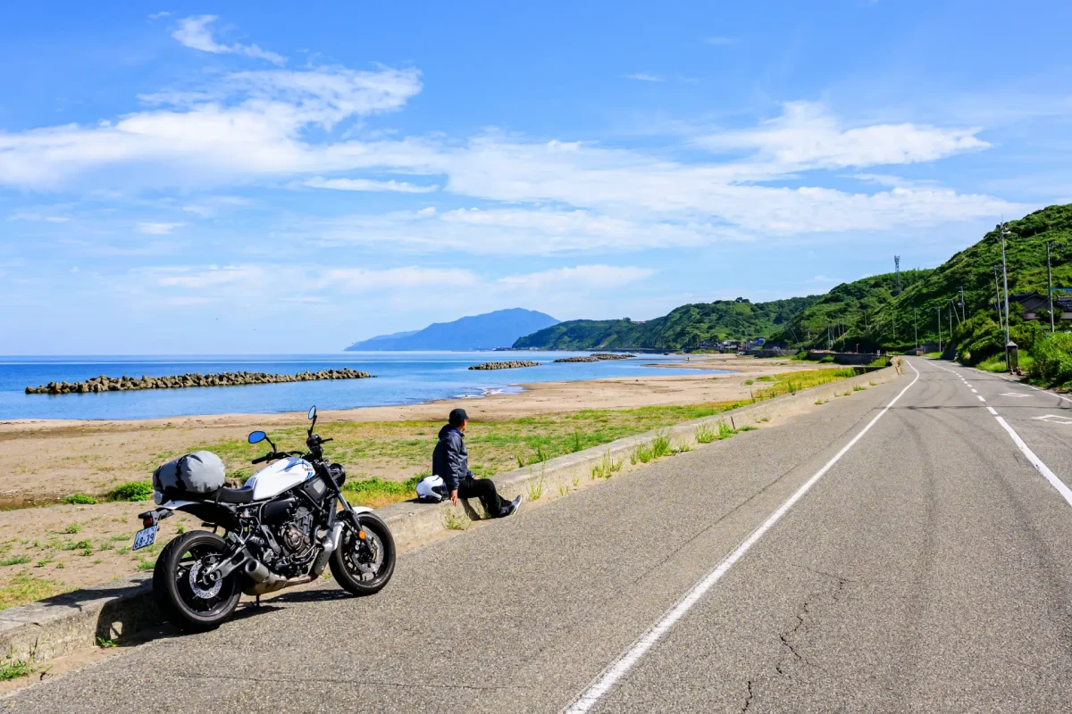 日本海の大海原を見ながら走れる道で、刈羽村から出雲崎、寺泊までは、佐渡島が浮かぶ海沿いの道が続きます。そして、道の先には「弥彦山」が見えてきます。