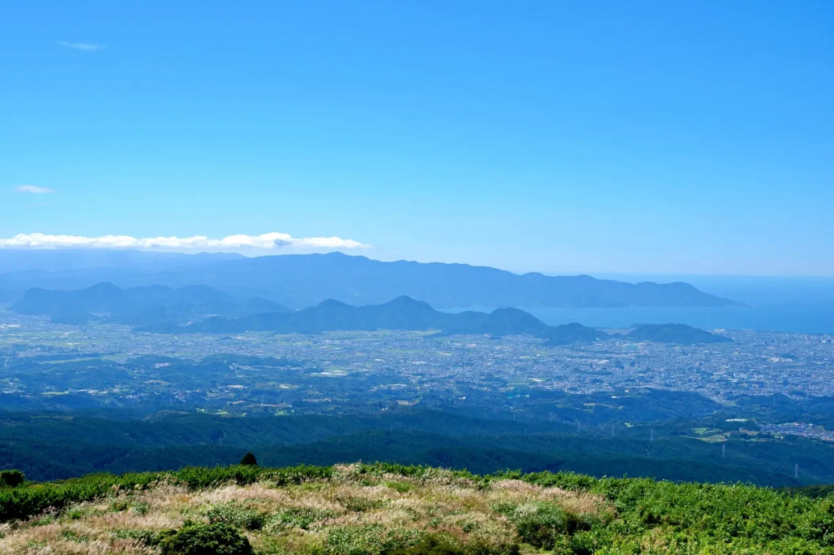 「レストハウスレイクビュー」から少し登るとビュースポットがある。手前の山並みが「沼津アルプス」。その向こうに伊豆半島