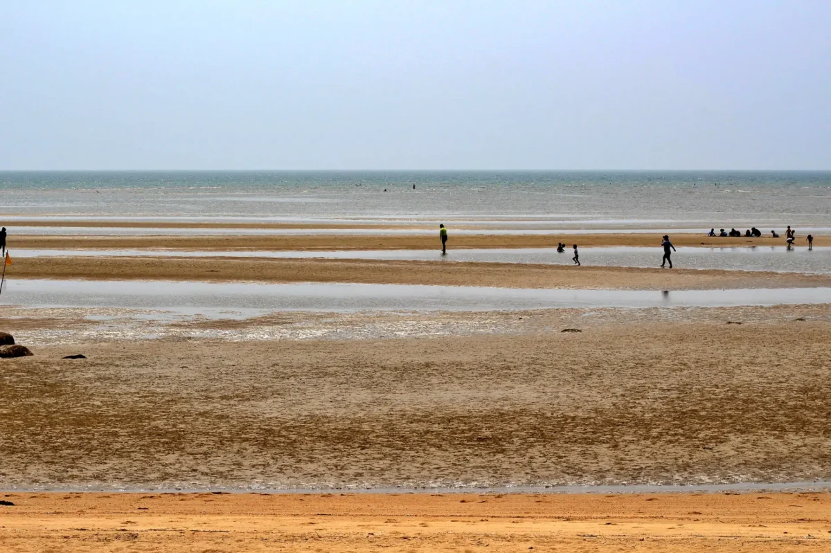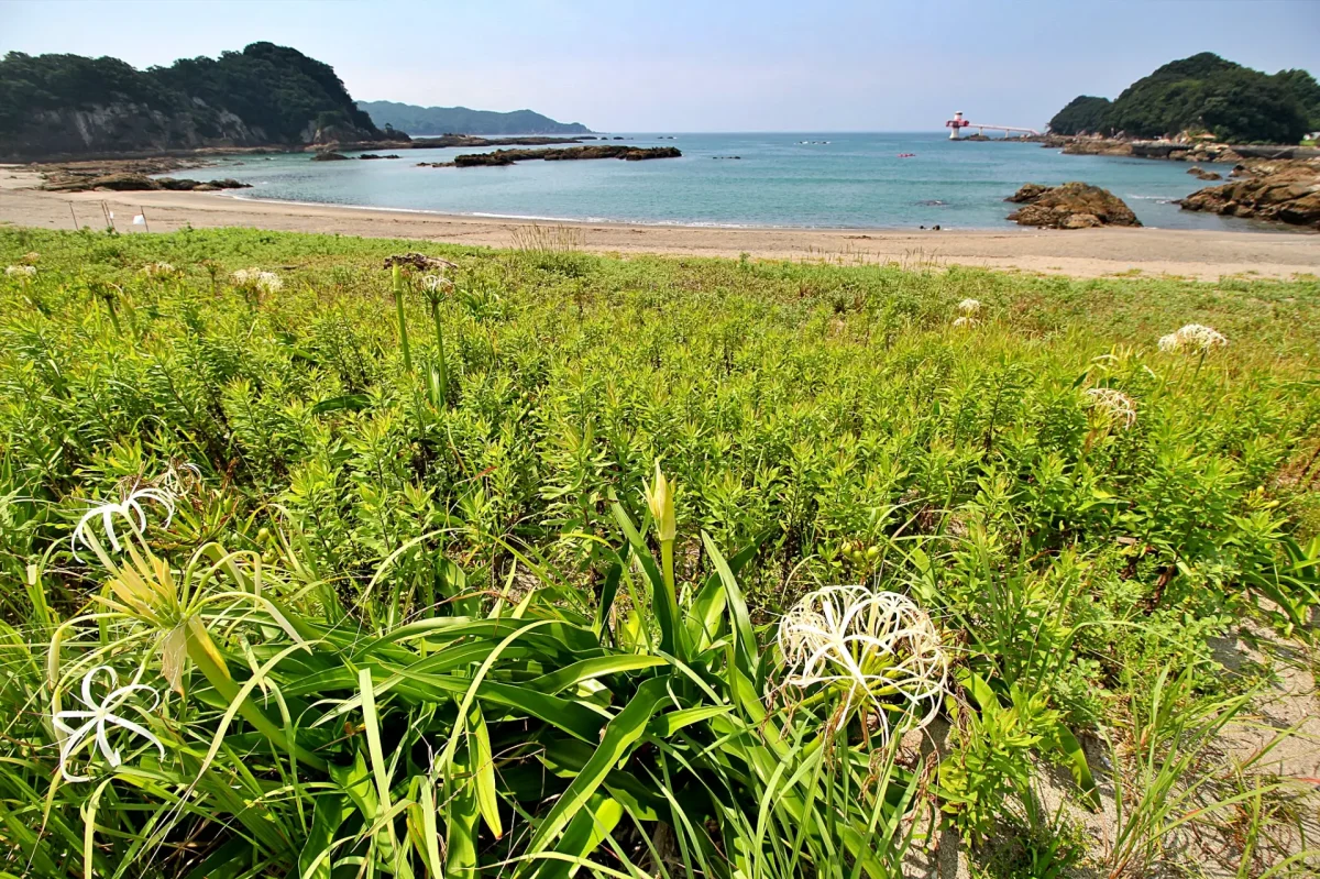 夏は海水浴で賑わう穏やかな遠浅な砂浜