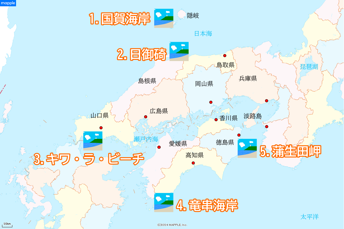 今回は、そんな美しい景観を見られる「海岸」を、『ツーリングマップル中国・四国』掲載エリアから、5箇所紹介します。早速見ていきましょう!