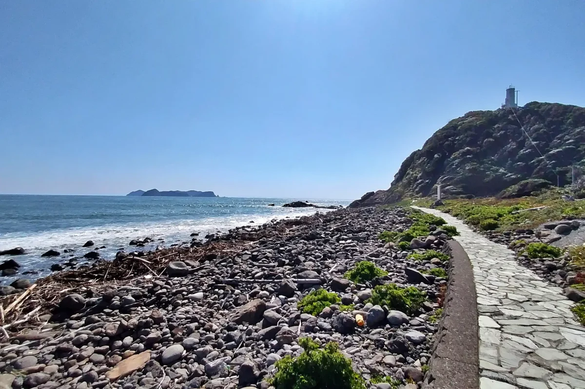 玉石の海岸沿いに続く、灯台に向かう遊歩道